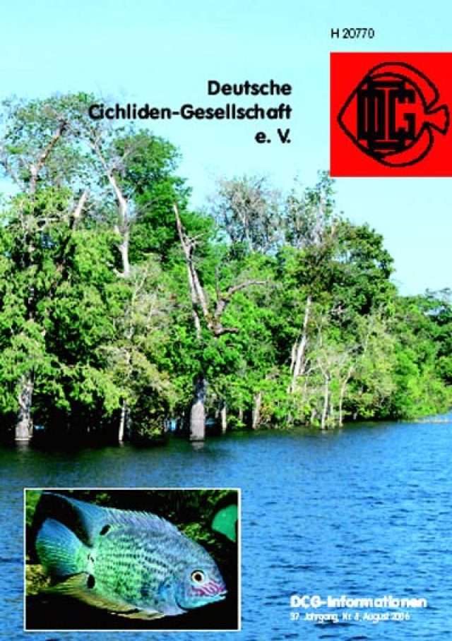 Bei Santarém wurden Augenfleckbuntbarsche vor allem in überschwemmten Bereichen, in denen Bäume standen gefunden. Die Bäume mit ihren vielen eng beieinander stehenden Stämmen und Ästen bieten den Buntbarschen Schutz vor Fressfeinden. Einblendung: Erwachsener Heros efasciatus aus Santarém in dominanter Stimmung (Fotos: Uwe Werner) - Werner, Uwe: